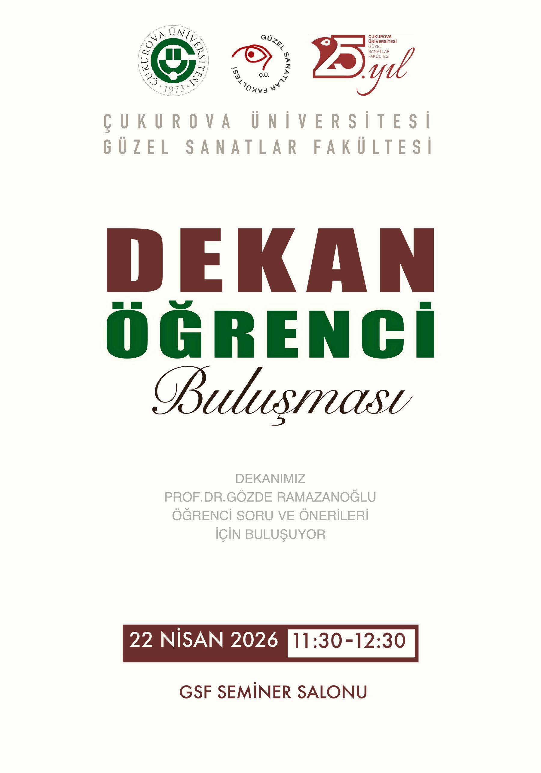 Dekanımız sayın Prof. Dr. Gözde RAMAZANOĞLU'nun öğrecilerimiz ile bir araya geleceği dekan, öğrenci buluşması 22 Nisan 2026 saat: 11.30-12.30 saatleri arasında fakültemiz seminer salonunda gerçekleşecektir.